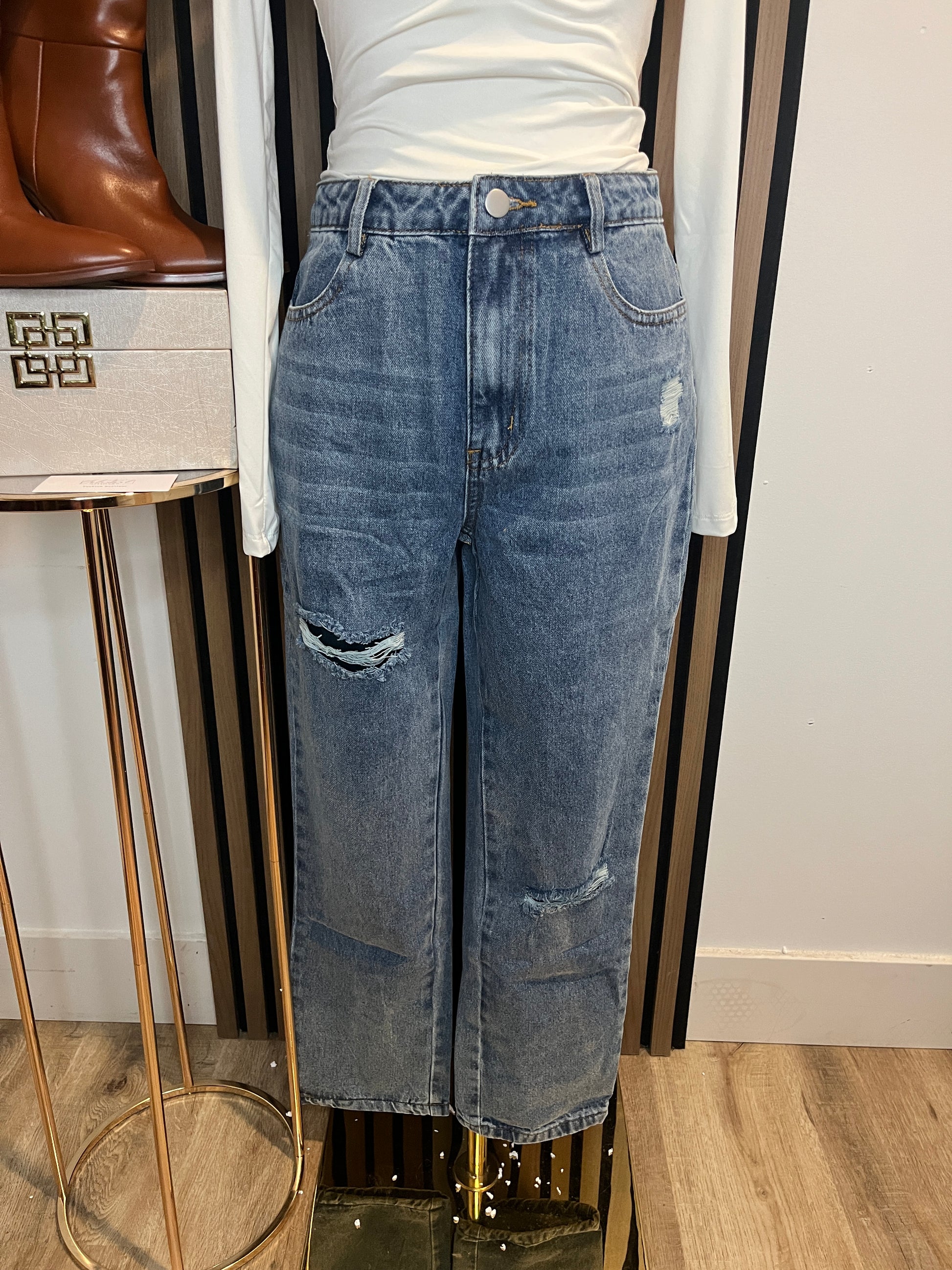 Elevate your style with these playful high-waisted mom jeans featuring a straight leg, distressed details, and a soft washed cotton finish for effortless cool.