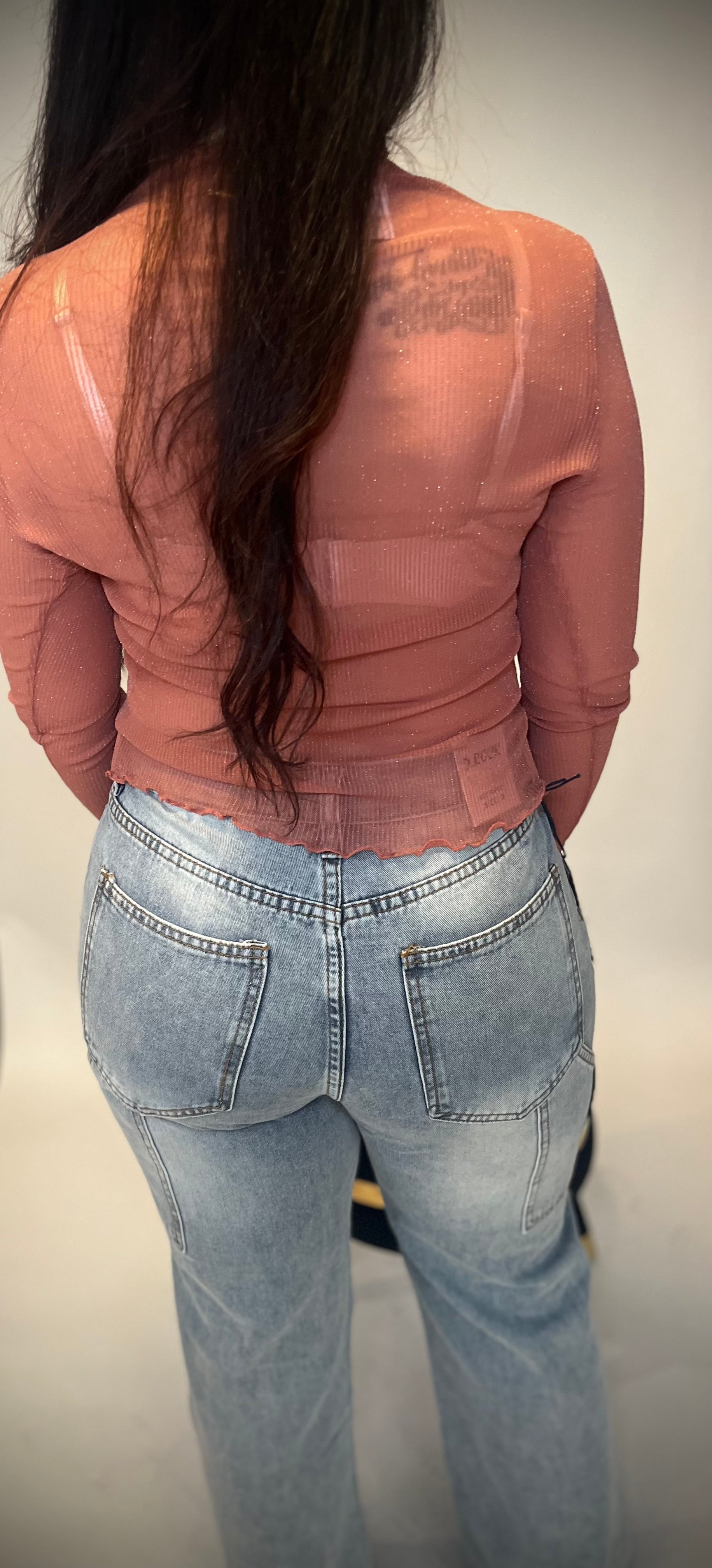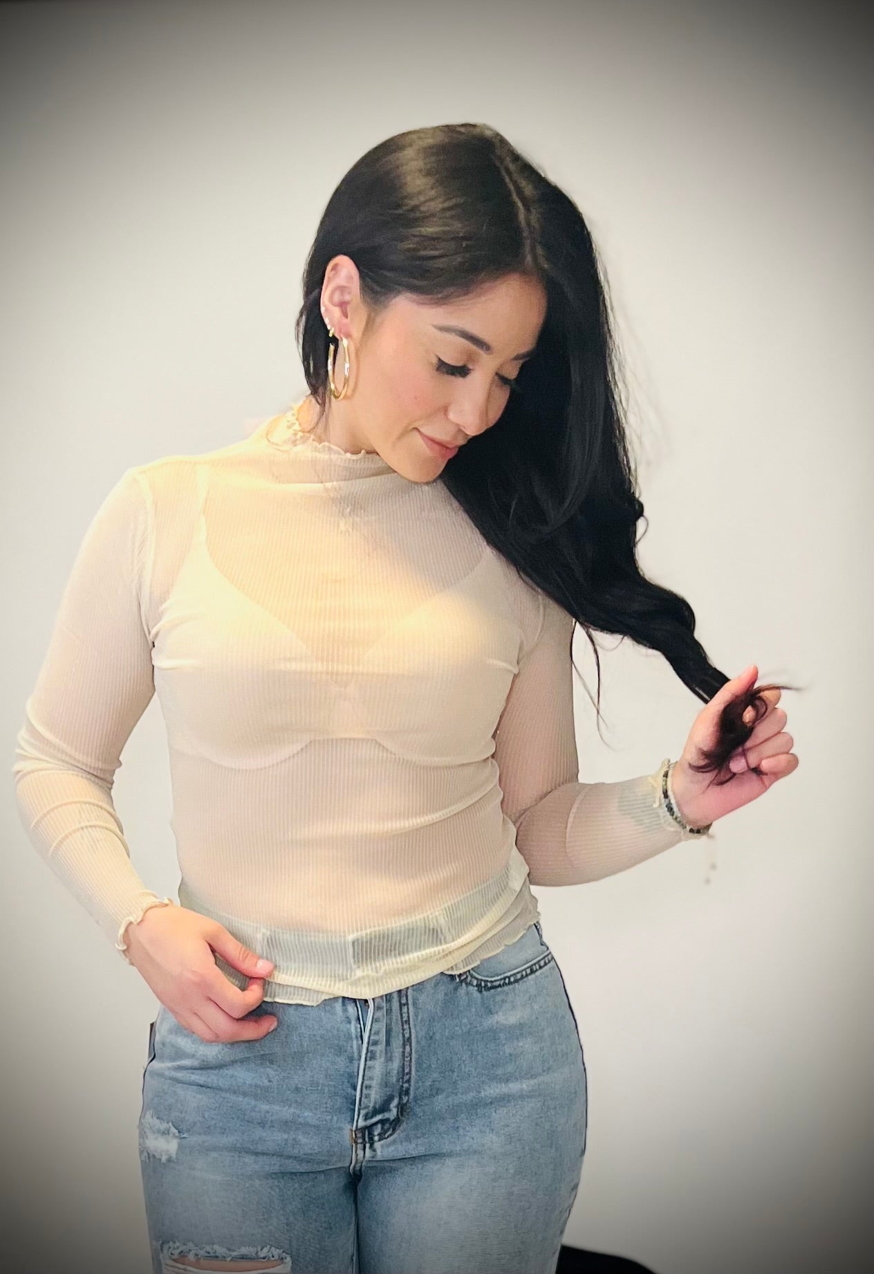 Long sleeve, lettuce-edged glitter mesh with a mock neckline features a semi-transparent layer, providing ample styling opportunities. Highly elastic, the glitter mesh ensures comfort. Material : 80% nylon, 15% polyester, 5% spandex.