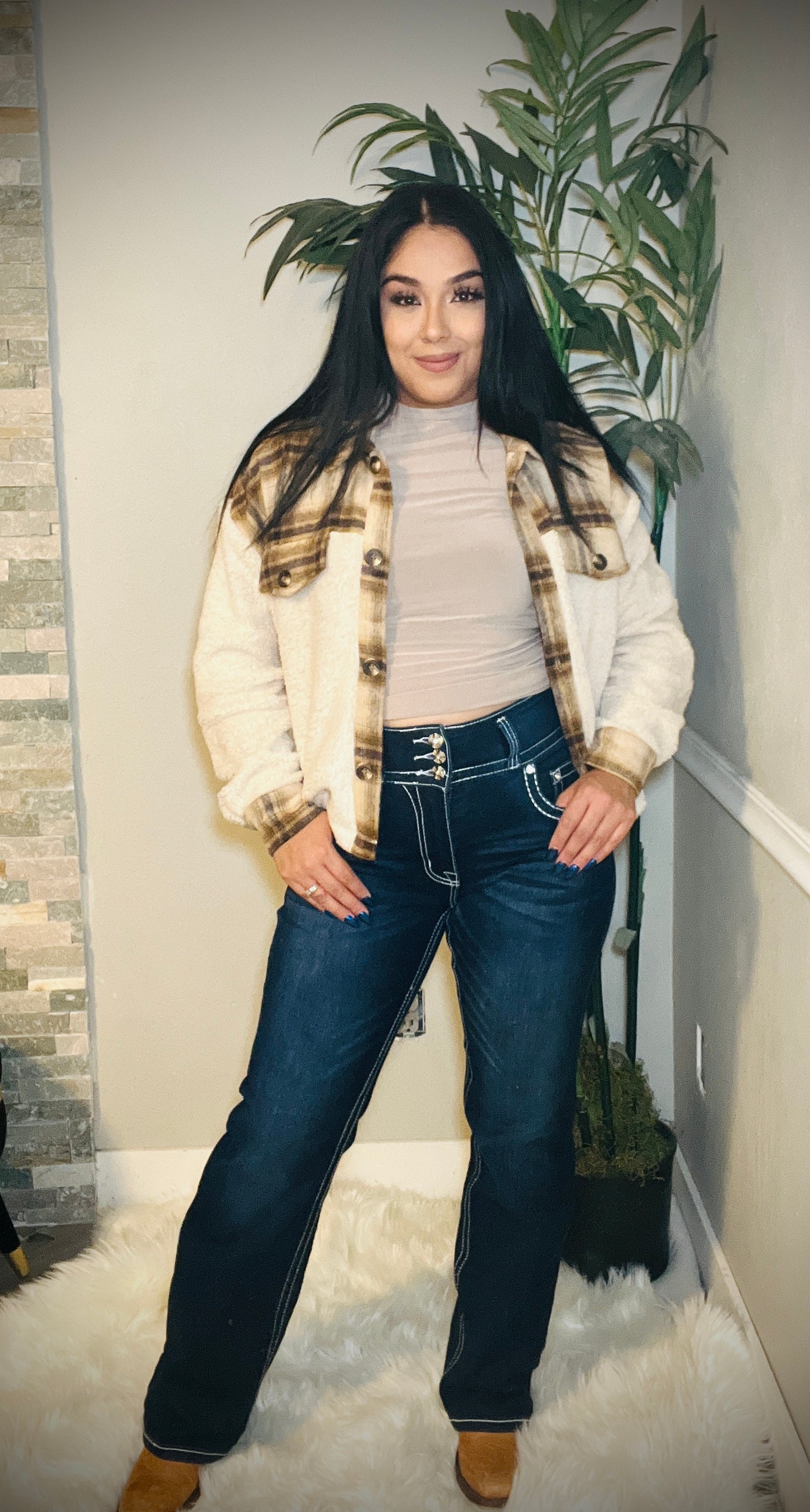 Tackle new terrain with these daring women's jeans! Featuring a high-waisted, stretch fit, slim through the hip and thigh, and bootcut for an edgy look, with fading and whiskering detail. Plus, an eye-catching jewel button-zip fly with belt loops and rhinestone rivets, plus 5-pocket style and embroidered back pockets with faux leather and rhinestone rivets. Size and fit: front rise 10" - inseam 31" - 1/2 waist 22"-23" - 15/16 waist 34"-35". Crafted from 70% cotton, 28% polyester, and 2% spandex; machine wash cold. Go ahead, take your style to new heights!