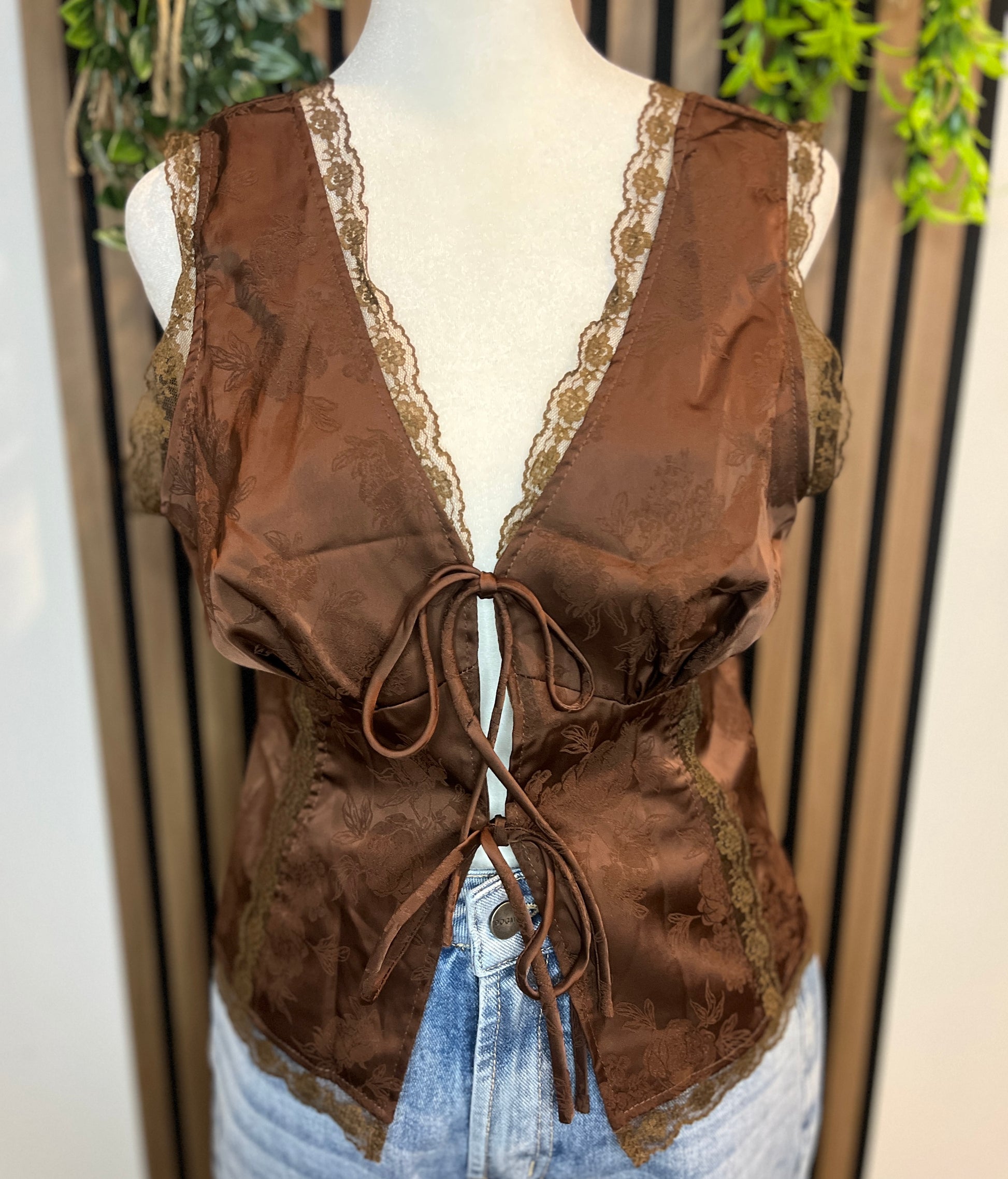 A daring sleeveless design featuring a deep V-neck, delicate lace trim, and a self-tie detail at the front for a bold, confident look.