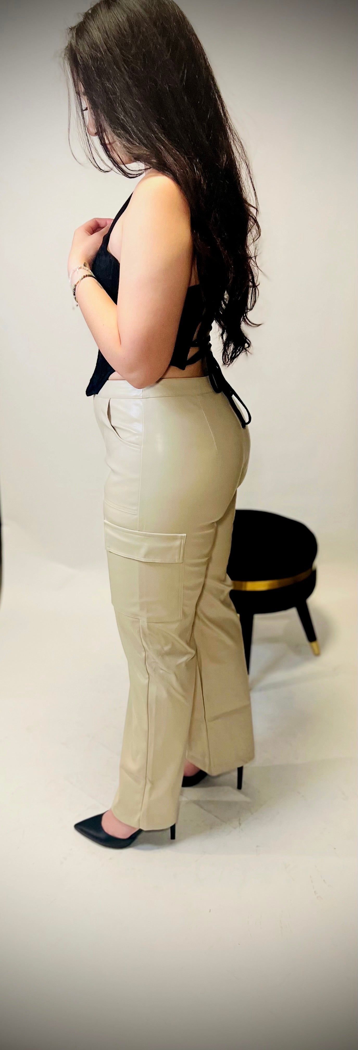Ladies, you've got to snag yourself a pair of these Woven Faux Leather cargo pants. Perfect for any occasion - from your 9-5 to a night out, or even a chill sneaker sesh. Plus, they've got a little bit of extra stretch for added comfiness. 100% Polyester and 100% amazing.