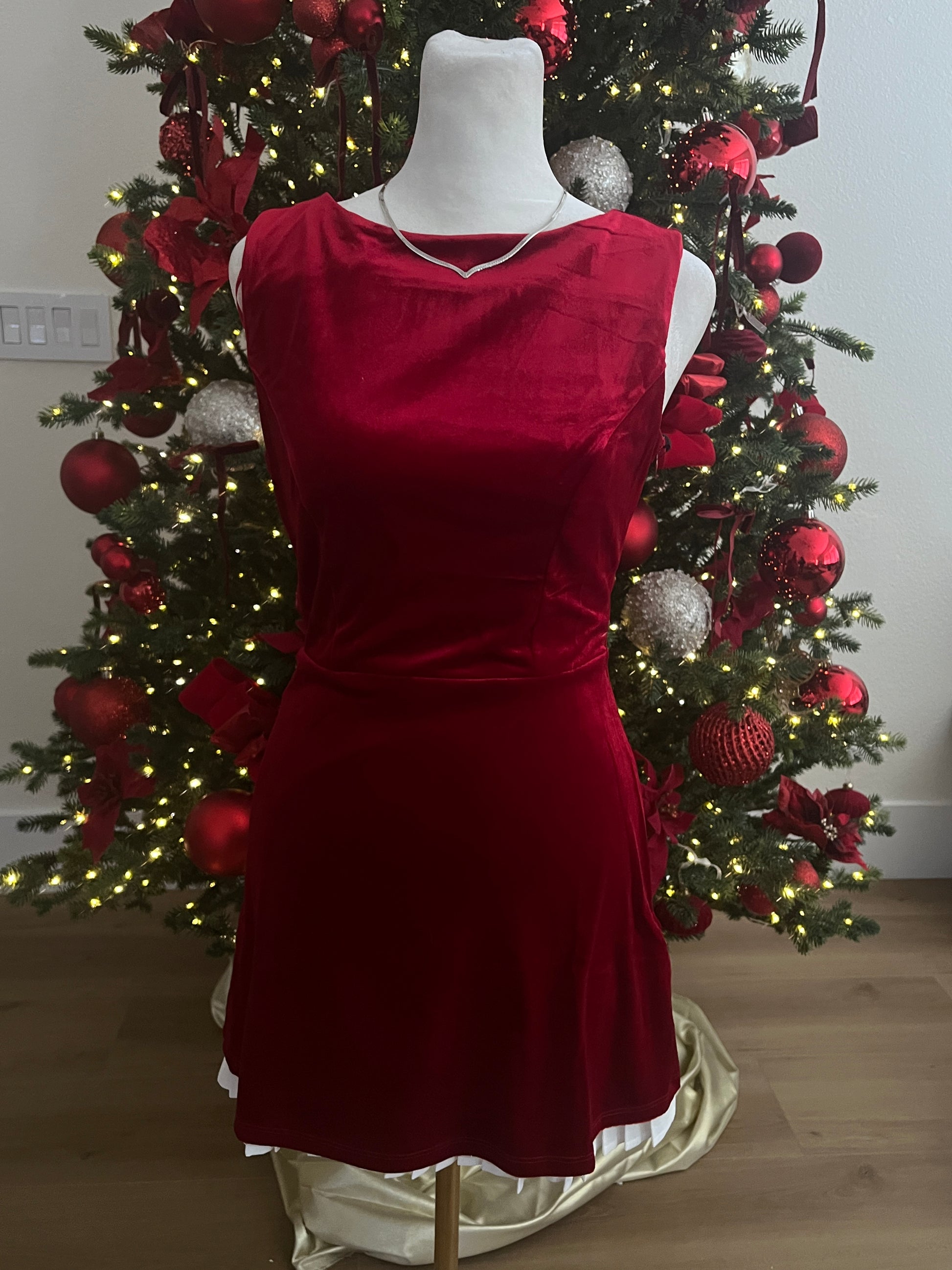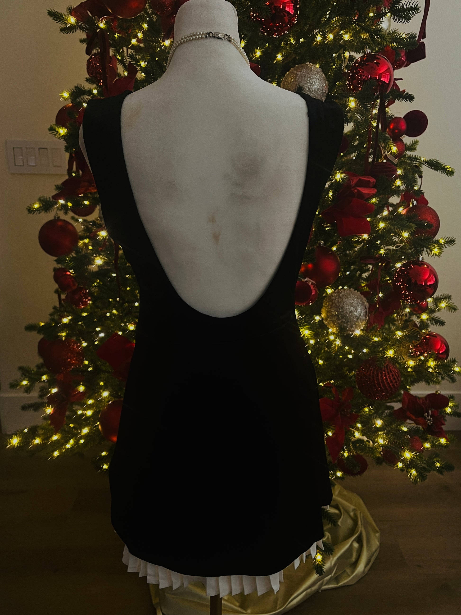Slip into pure confidence with this audacious velvet mini dress. The striking boat neckline and sleeveless cut command attention, while the daringly low back adds an unexpected edge. An elegant A-line silhouette flatters your figure with effortless movement, making this the perfect statement piece for nights when you're ready to turn heads.