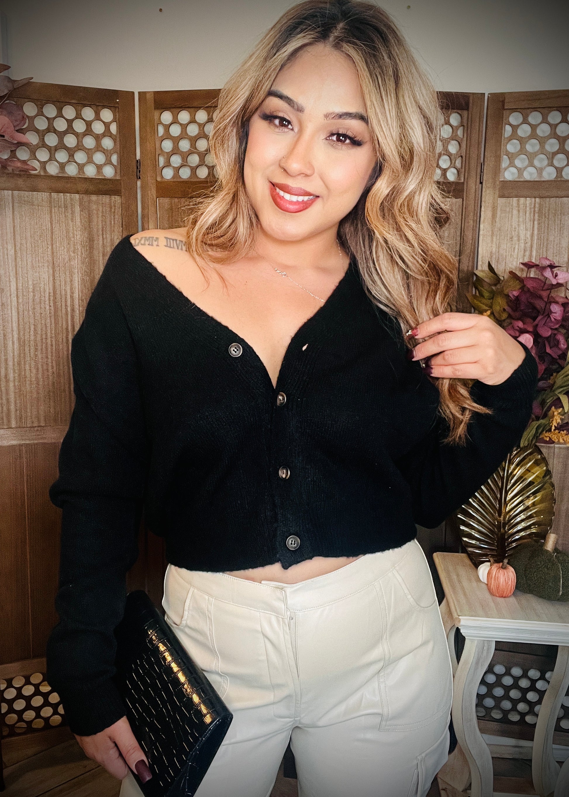 Embrace adventure with this daring FRONT BUTTON DOWN KNIT CARDIGAN featuring a sleek V-NECK and LONG SLEEVE design.