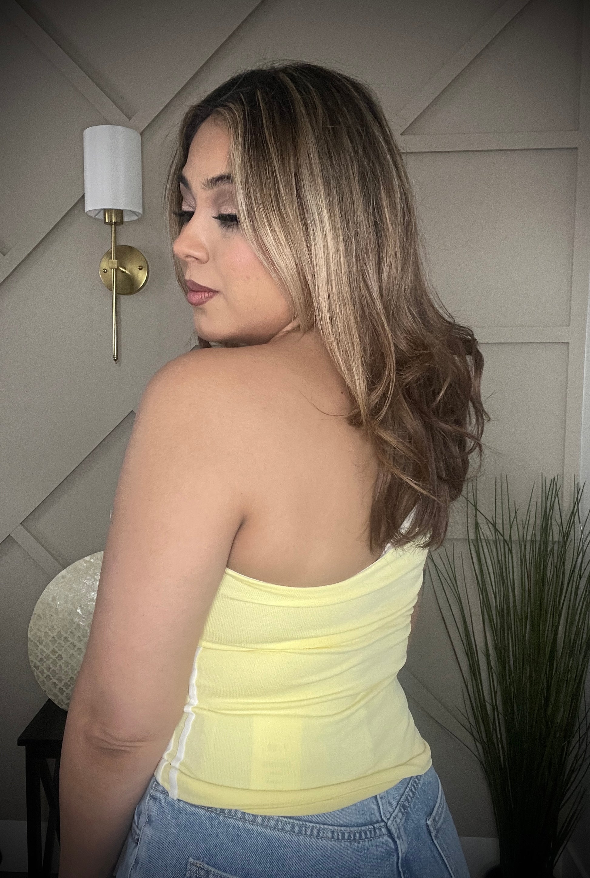 Sporty one-shoulder tank in retro design with seamless ribbed fabric. Features retro 91 print and double line detail.