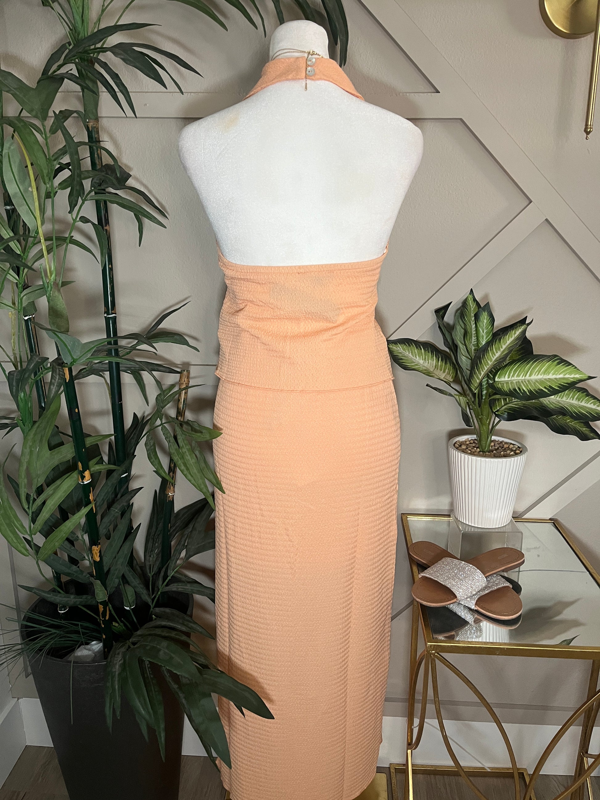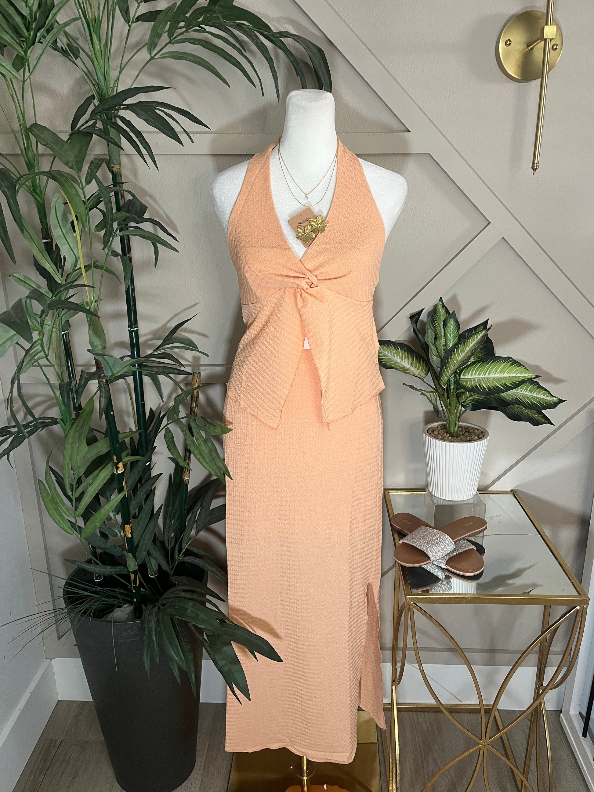 Go for an electrifying look with this set featuring a textured knit halter top and a midi skirt.